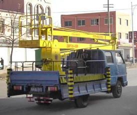 一種利用汽車引擎動力驅(qū)動的折臂式高空作業(yè)車。車輛的行走功能,使升降平臺有更好的靈活性和機動性,使高空作業(yè)效率更高。折臂結(jié)構(gòu)緊湊,采用新型型鋼,強度高,重量輕,架設(shè)速度快,工作臺既可升高又可水平延伸,還可旋轉(zhuǎn)360度,易于跨越障礙到達工作位置。